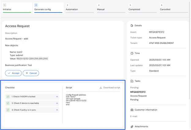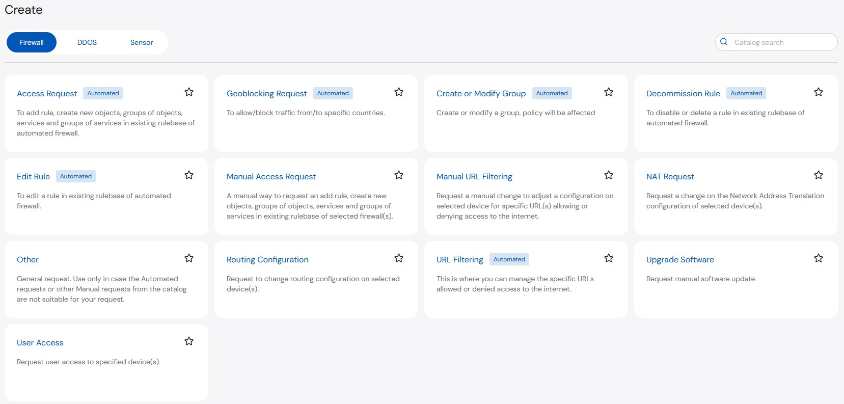 - Access Request (Automated): To add rule, create new objects, groups of objects, services and groups of services in existing rulebase of automated firewall.