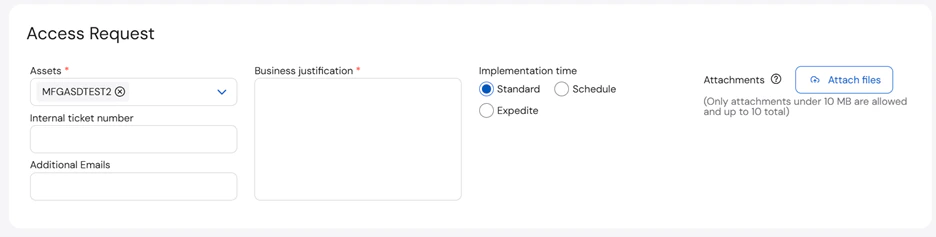 From the Create page, a user will select an Action (such as Add Rule) first. The information required is dependent on the action, but the high-level steps are as follows:Complete the required information at the top of the page: Asset(s), Business Justification, and Implementation time