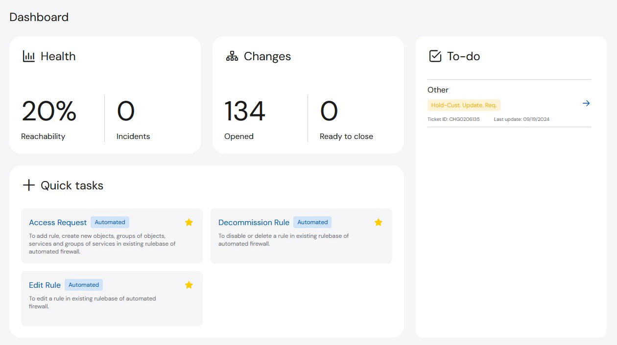 - Changes: The Changes widget provides a summary for all Open and Ready to Close Change tickets that are open across the company. Ready to Close changes are waiting for customer feedback in order to close.