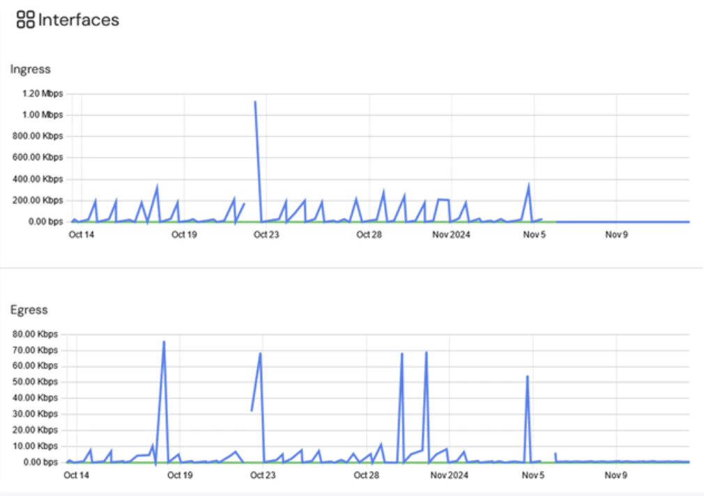 The Interfaces section provides details for the Ingress and Egress for all of the Interfaces associated with the selected asset. To display a graph of the traffic, select the checkbox next to the designated interface.