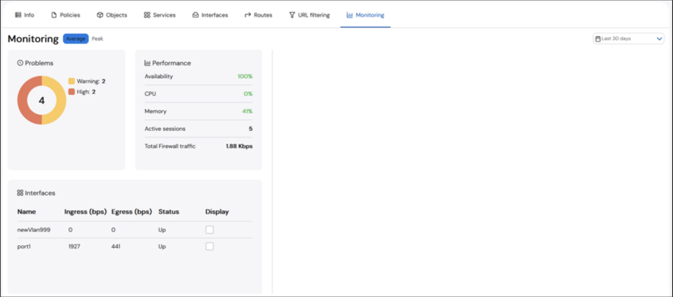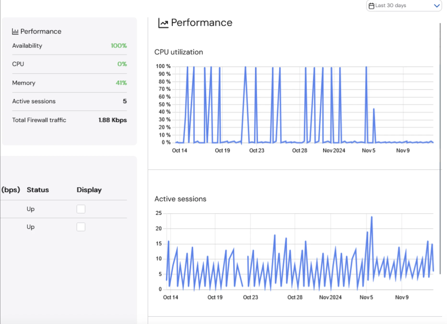 The Performance box provides information about the performance of the device, including the availability, CPU, memory, number of active sessions, and total firewall traffic. A user can click on any of the values in the box to see graphs of the data.CPU utilization is an average of all CPU cores at a given time.