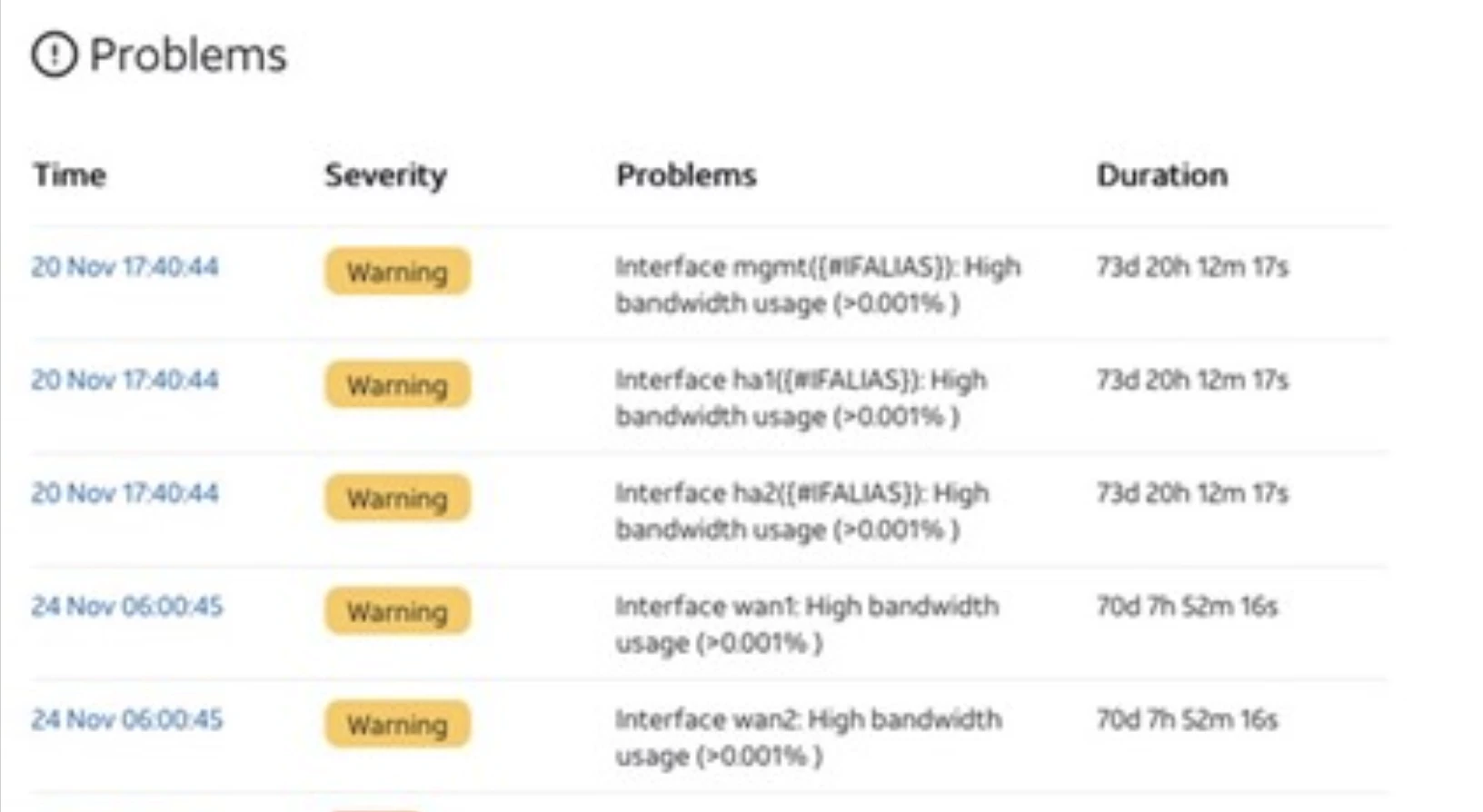 In the top left Problems box, there is a number displaying the total number of current problems detected by the solution monitoring tools. A user can click the circle to see details about the problems, including the time the problem occurred, the severity, details of the issue and the duration of the problem.The duration time will only be updated when browser window is refreshed.