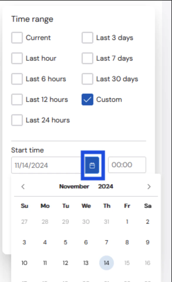 For a custom date range, select the box next to Custom, and options will appear at the bottom of the window