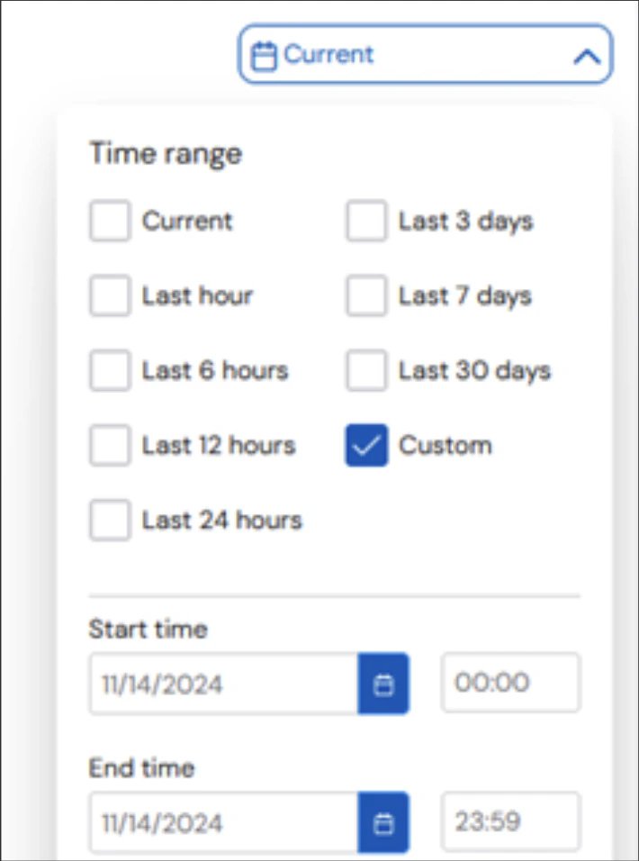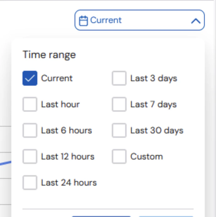 A user can select the timeframe from which the data is being displayed. The default time frame is Current.The larger the time range, the longer it will take for the data to be displayed.