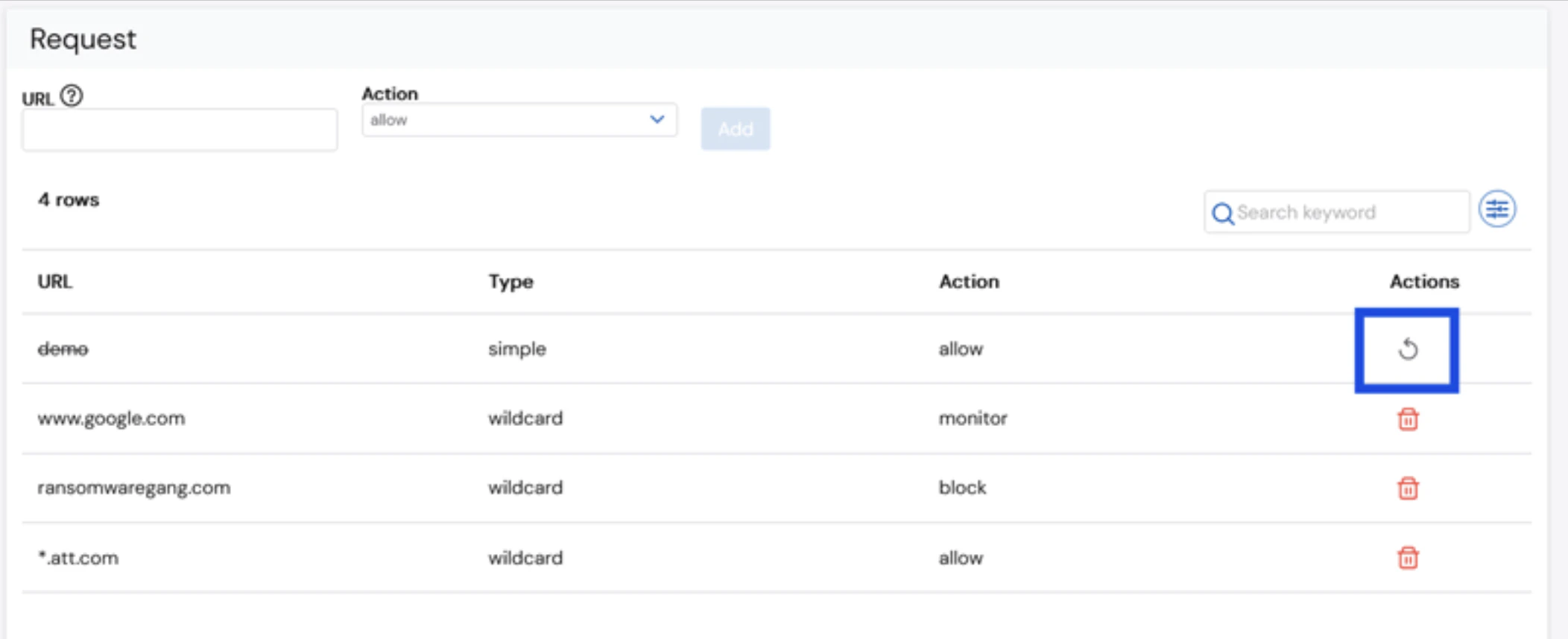 (optional) URL requests may be deleted by clicking the Trash bin icon. Deleted entries appear as stricken through.