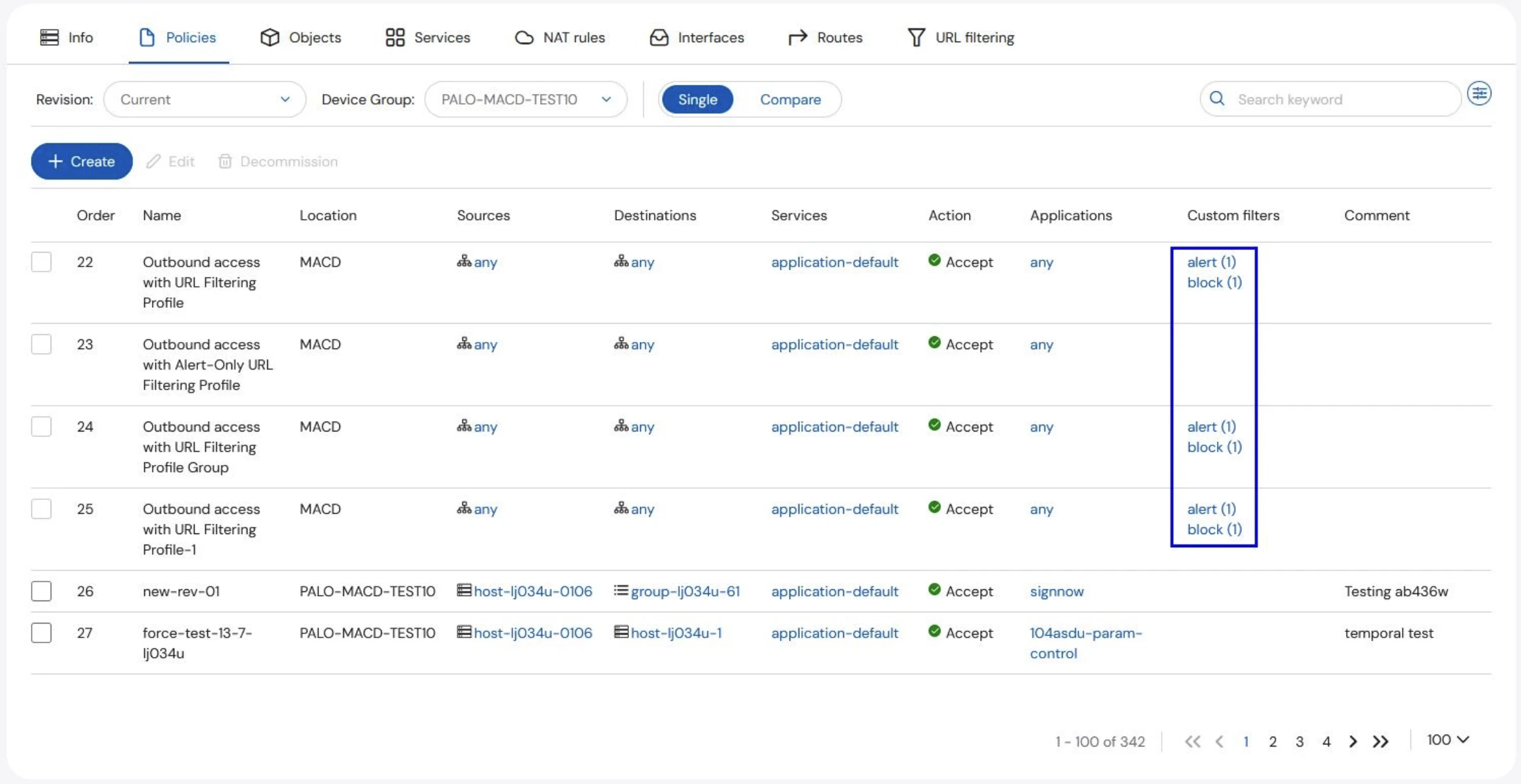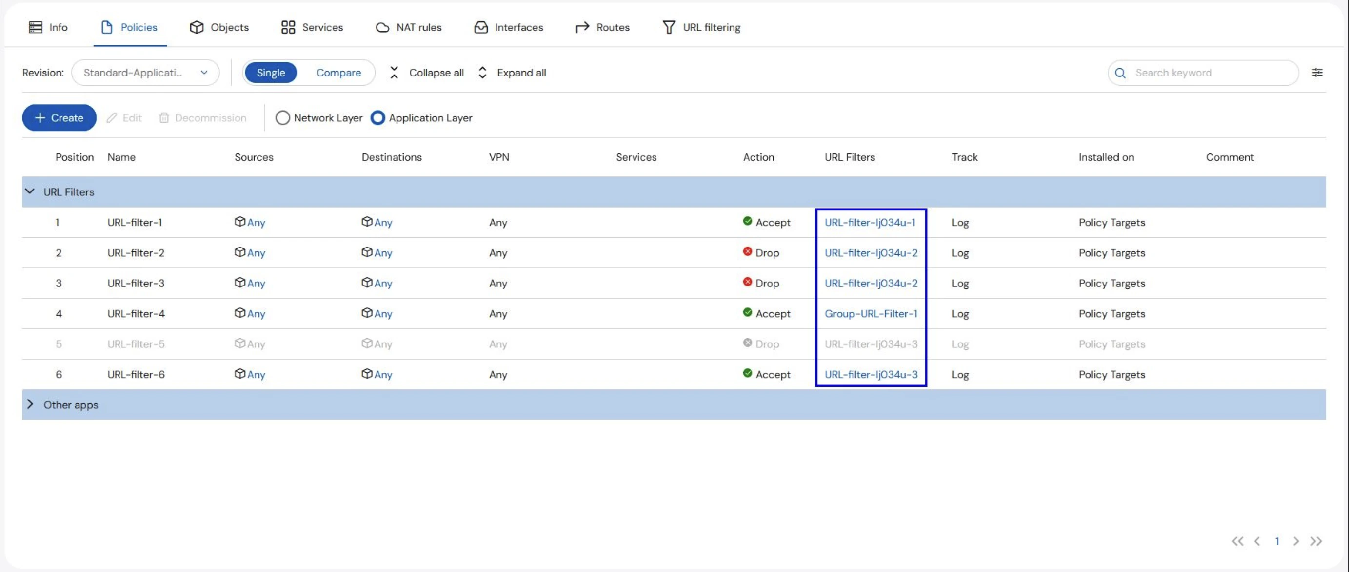 To view URL filters on a specific asset, go to Manage, then the Policies tab. URL filters are displayed in the URL filters column on the Policies table when the Application Layer radio button is selected. Whether the filter blocks or allows traffic is defined by the Action of the rule.