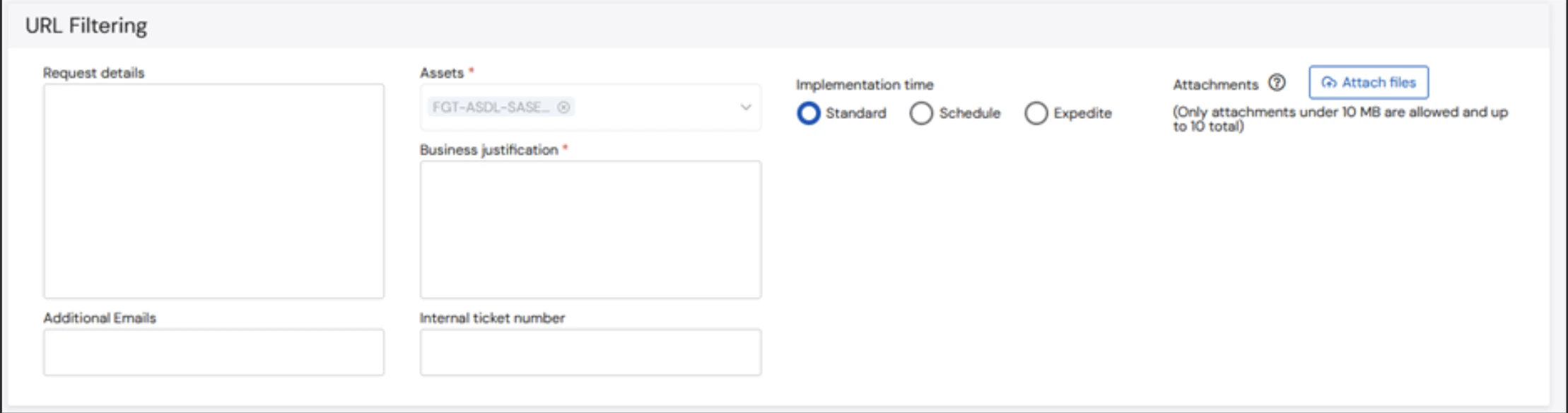 Fill in the required information at the top of the form: Assets, Business Justification, Implementation time, Request Details (optional), Additional Emails (optional) and Internal Ticket Number (optional)