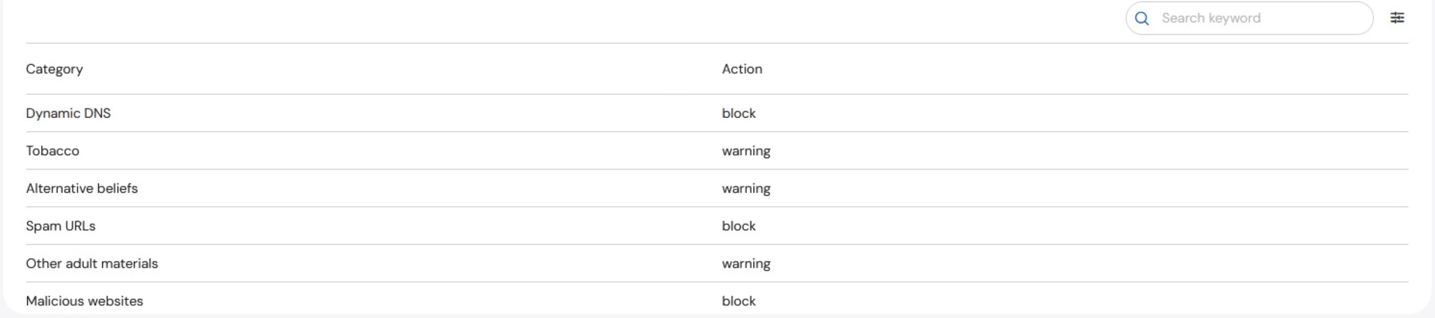 To view URL filters on a specific asset, go to Manage, then the Policies tab. URL filters appear in the Security Profile column of the Policies table. When a filter exists, it is listed as “Web Filter:” within the Security Profile column: