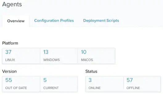 The Agents page (Data Sources > Agents) provides an overview of your deployed LevelBlue Agents. Click the displayed numbers to view the agents in the Assets page (Environment > Assets). If there are unassociated agents, this page displays an alert to help you resolve them. See LevelBlue Agent and Asset Associations for more information.