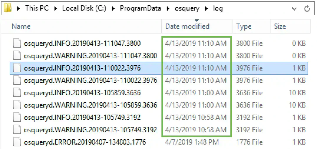 Once the watchdog limit is reached, the osquery watchdog respawns the child worker process. After osquery is restarted, the previously active queries are referenced by osquery to see which ones did not finish normally. It is possible that one or more of these queries caused the watchdog limit to be exceeded, therefore the unfinished queries are denylisted from the scheduler for 24 hours. If the osquery processes exceed their allocated resources, there is the possibility that the watchdog may respawn the process without giving any error message. A good indicator that this has happened can be found by looking at the logs subdirectory and at the timestamps of the files. If there is a high number of files with timestamps that are close together, it could be that the watchdog has been killing processes due to resource allocation limits. Here is an example: