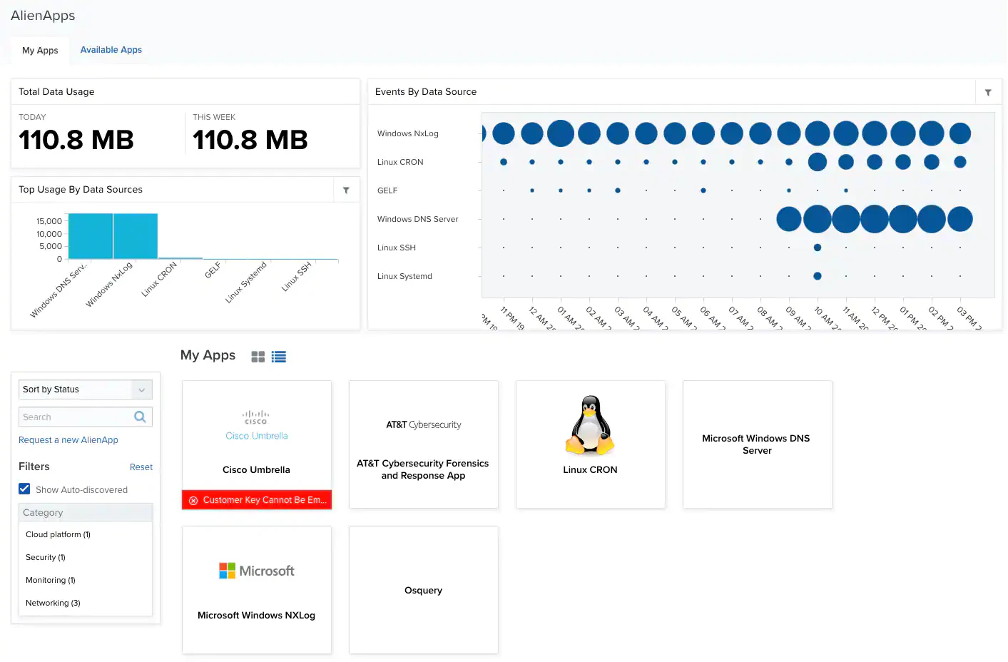 The My Apps tab gives you information about the apps you have configured in your environment:- Total Data Usage: Total data usage for the current day and for the current week.