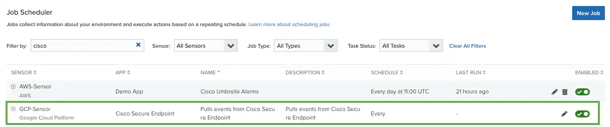 - In the Job Scheduler, search for the Cisco Secure Endpoint app on the sensor it was deployed to.