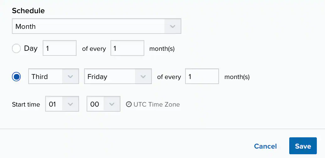 b. Set the interval options for the increment. The selected increment determines the available options. For example, on a weekly increment, you can select the days of the week to run the job.Warning: After a frequency change, monitor the system to check its performance. For example, you can check the system load and CPU. See USM Anywhere System Monitor for more information.Or on a monthly increment, you can specify a date or a day of the week that occurs within the month.