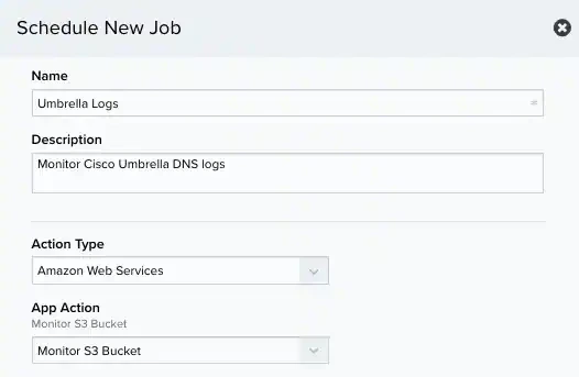 The Schedule New Job dialog box opens.Note: If you have recently deployed a new USM Anywhere Sensor, it can take up to 20 minutes for USM Anywhere to discover the various log sources. After it discovers the logs, you must manually enable the AWS log collection jobs you want before the system collects the log data.