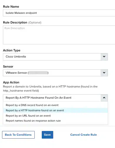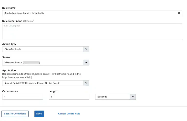 When you use one of the suggested rules, you can start with a set of matching criteria for common use cases, such as sending the HTTP hostname from phishing events to Cisco Umbrella.To create a new rule from a suggested rule