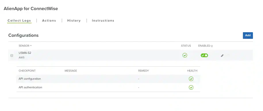 After USM Anywhere completes a successful connection to the ConnectWise Manage REST APIs, a