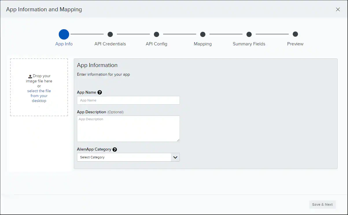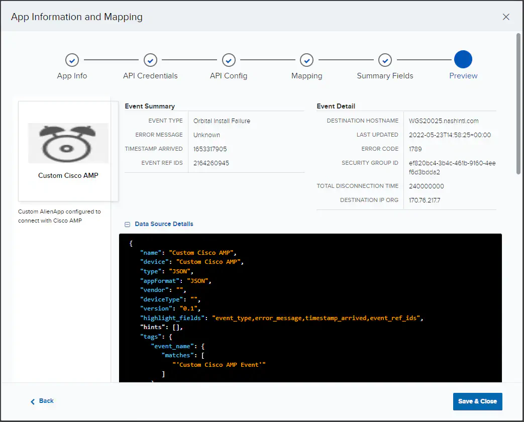 - Once you have finished all of the configuration steps for your custom advanced BlueApp, click Save & Close to create it. It will now be available to you under the My Apps tab of USM Anywhere.
