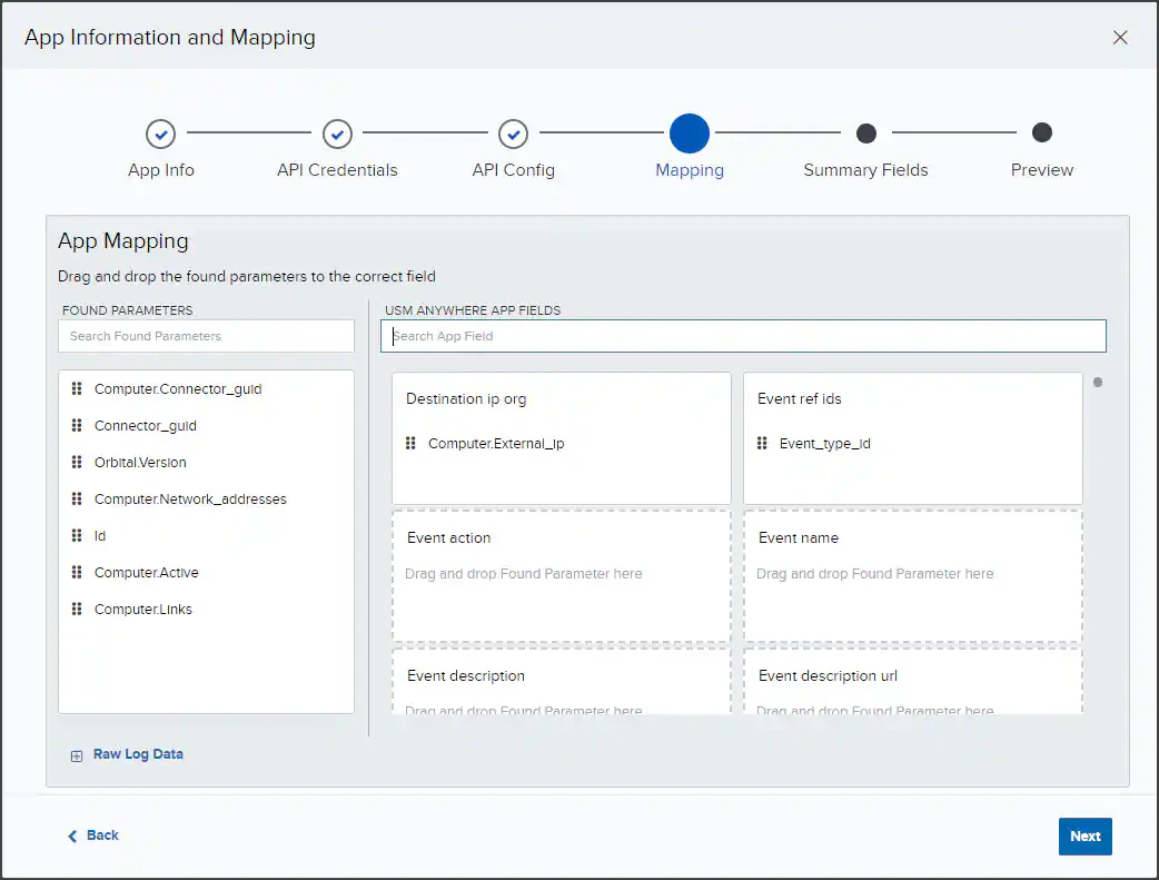 See Event Keys for detailed definitions of the standard USM Anywhere data fields to help you match the extracted fields with those from USM Anywhere. Click Next to continue.Note: You can map multiple found parameters to the same USM Anywhere app field. -