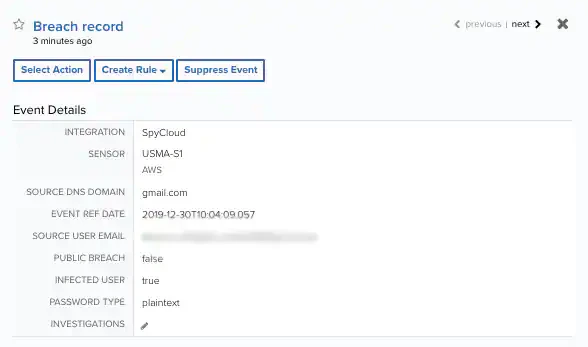 The BlueApp for SpyCloud Dark Web Monitoring leverages the SpyCloud APIs to retrieve breach records. See the SpyCloud API documentation for more information about the attributes (data fields) it stores in these breach records.