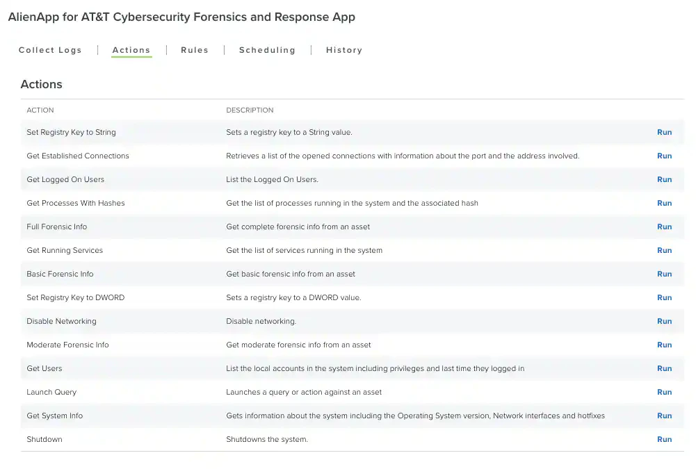 For many of the most common functions, the BlueApp for LevelBlue Forensics and Response also provides actions to launch a simple execution of that function. The table below describes what each action does:| Action | Description | Availability |