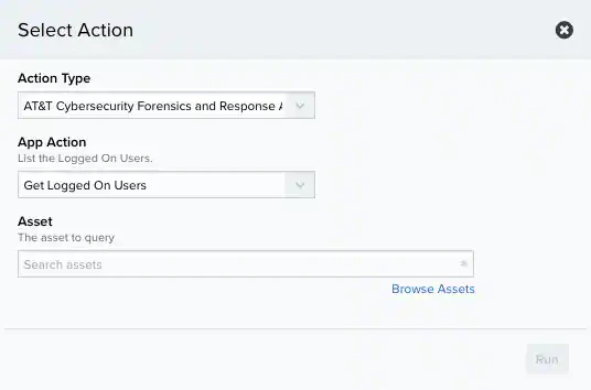 - Specify the asset that you want to use as a target for the action. You can enter the name or IP address of the asset in the field to display matching items that you can select. Or you can click Browse Assets to open the Select Asset dialog box and browse the asset list to make your selection.