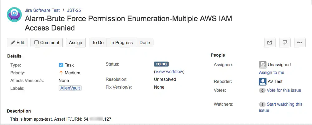 - Click the Issues tab. The displayed list includes all Jira issues generated by USM Anywhere, with the most recently opened issues at the top. Here you can view the status and assignment for the issue as reported by your Jira instance.