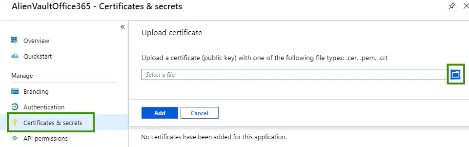 cert.pemfile created in the previous procedure, and then click Add. The credentials of the application are updated. -