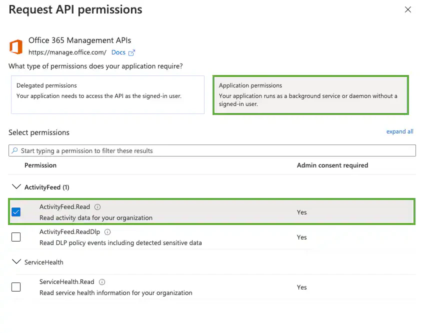 Add permissions for accessing Office 365 Management APIs: