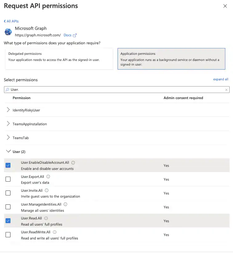 d. Expand User to select User.Read.All and Users.EnableDisableAccount.All permissions, and then click Add Permissions.