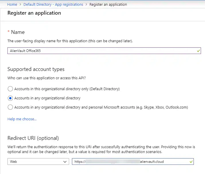 c. In Redirect URI, enter your USM Anywhere login URL (for example, https://acmecompany.alienvault.cloud).