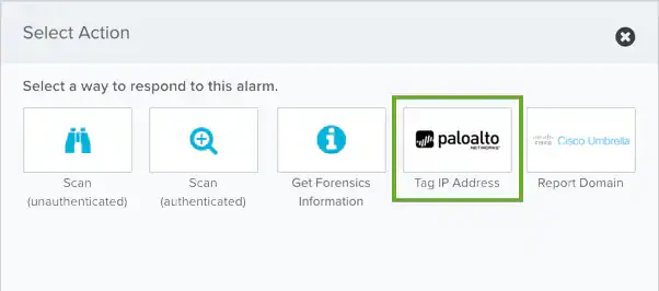| Tag Destination IP Address from Alarm | Run this action to tag a destination IP address to a dynamic group address from an alarm |