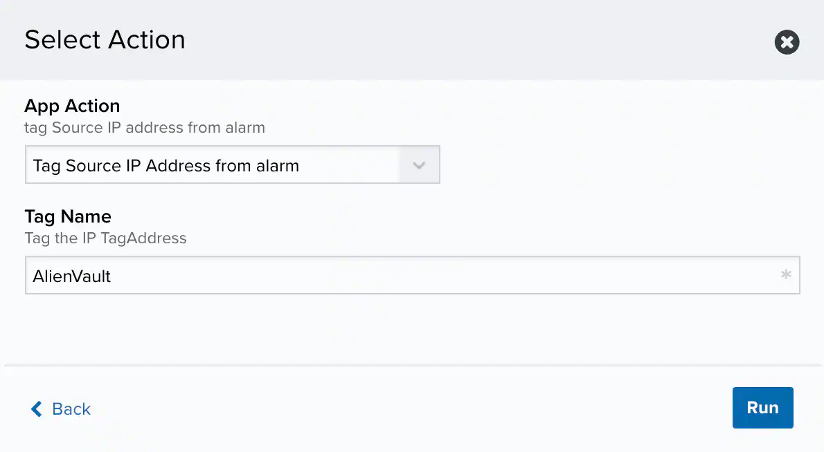 - For the App Action, select the action you want to launch. Additional fields will be populated based on the action you’ve selected. Fill out the necessary fields for the app action. You can launch an action to tag the alarm destination host or source host.