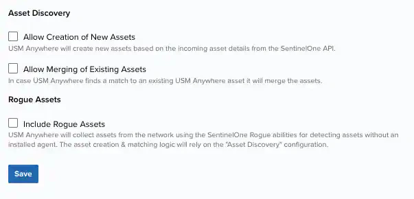 - Select the Allow Merging of Existing Assets checkbox to enable USM Anywhere to run a match against the SentinelOne identification to merge the assets found with existing USM Anywhere assets.