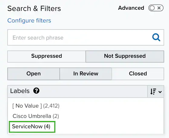 Locate the Labels filter and select ServiceNow.