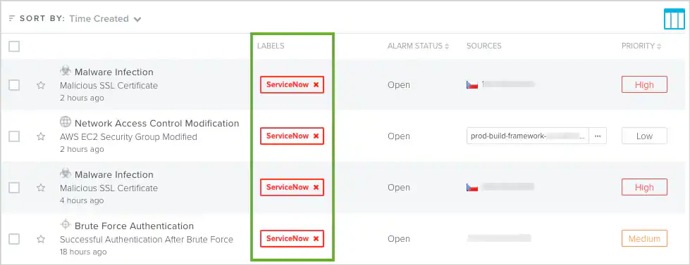 USM Anywhere uses labels as a mechanism to classify alarms and vulnerabilities. These labels make it easy to filter items by label so that you can locate them easily and track their status. When the BlueApp for ServiceNow executes a response action for an alarm or vulnerability, it automatically applies the ServiceNow label to it. You can use this label as a filter so that a page displays data for only those items related to an BlueApp for ServiceNow response action. To view ServiceNow action alarms or vulnerabilities- Open the Alarms page or Vulnerabilities page.