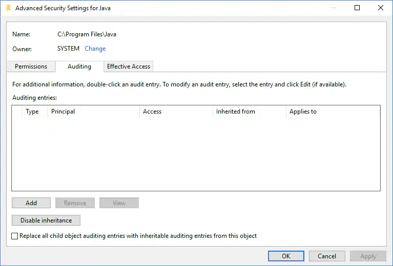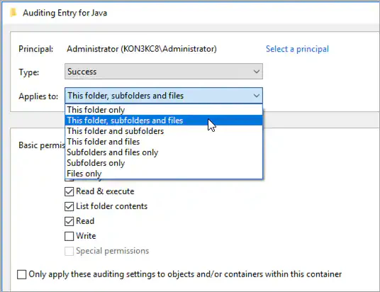 - (Optional) If you want to prevent subordinate files and subfolders of the original object from inheriting audit settings, select the Apply these auditing entries to objects and/or containers within this container only option.