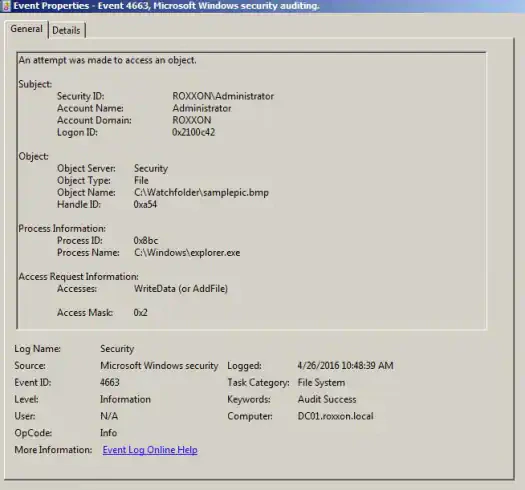 After enabling object access auditing, view the security log in the Windows Event Viewer to see that the audit events are now collected. You can test to make sure the events are properly generated in Windows Event viewer by creating a file, editing it, moving it out of the folder, and then moving it back. This should generate the events in the Event Viewer of a Windows Server similar to the following example.