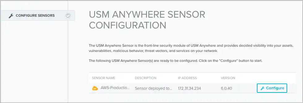 Upon login, this displays the USM Anywhere Sensor Configuration page with the connected sensor listed in the page.