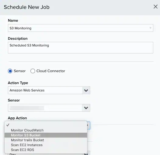 The Schedule New Job dialog box opens.Note: If you have recently deployed a new USM Anywhere Sensor, it can take up to 20 minutes for USM Anywhere to discover the various log sources. After it discovers the logs, you must manually enable the AWS log collection jobs you want before the system collects the log data.