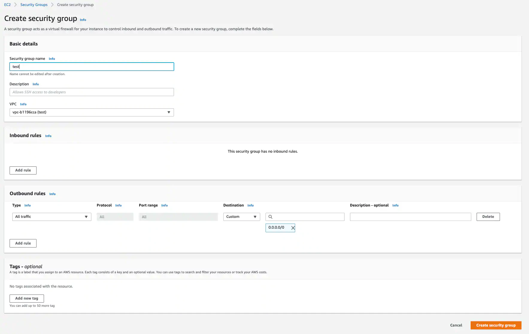- Outbound: Select all traffic, all protocol, all port range, and 0.0.0.0/0 as the destination