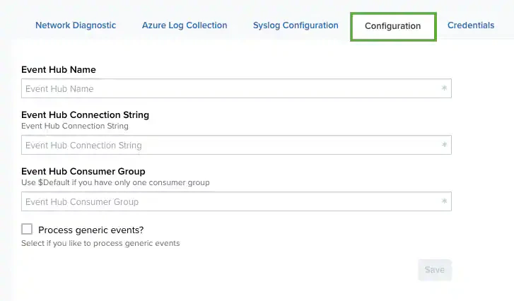 - Event Hub Connection String: A string containing unique configuration data about your Azure Event Hubs implementation. This is the connection string that was copied under Connection String–Primary Key in the Stream Logs to Azure Event Hubs procedure.