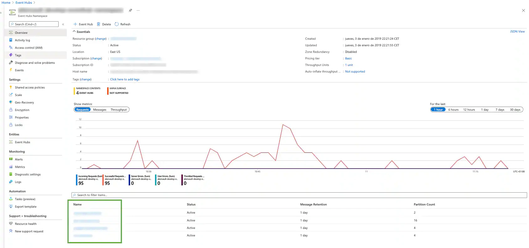 - Event Hub Consumer Group: The name of your Event Hubs consumer group. You can locate this name by opening your Event Hubs overview in the Azure portal and scrolling to the bottom of the page.