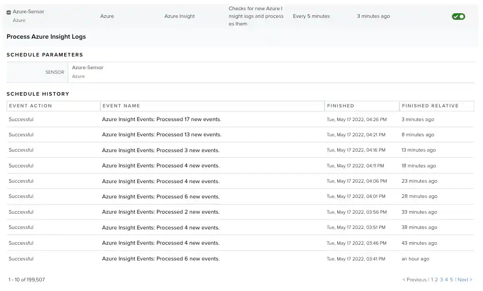For individual VMs running IIS with Azure diagnostics enabled, you can designate storage for the IIS logs. USM Anywhere automatically detects these logs through the Azure APIs and Azure software development kits (SDKs). For each Azure Storage container locations with Azure IIS logs that it detects, USM Anywhere creates a default log collection job. When you complete the Log Collection step for your Azure Sensor setup, you can enable these default jobs, which run every five minutes.You can also enable or disable this default job in the Job Scheduler. When you select the job in this page, you can review the history for the scheduled job. You could choose to disable this default job based on the IIS log locations that USM Anywhere discovers, and create a custom Azure IIS log collection job for a location that you specify.