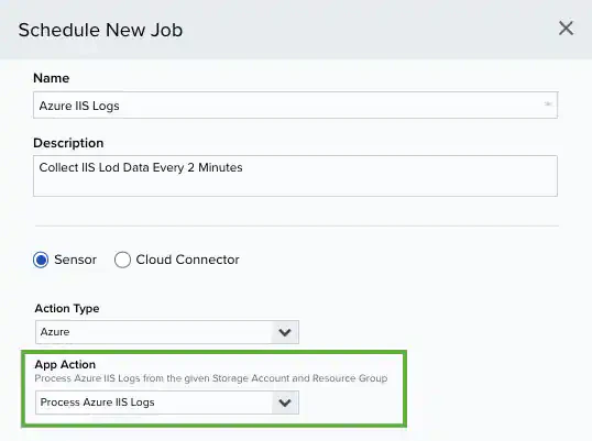 When you configure the new job, set the App Action option to Process Azure IIS Logs. You must also specify the Resource Group, Storage Account, and Blob Container for the custom log collection job. See Create a New Azure Log Collection Job for more information about scheduling an Azure log collection job.