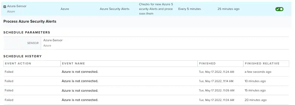 Microsoft Azure Security Center is an Azure service that continuously monitors your Azure environment and applies analytics to automatically detect a wide range of potentially malicious activity. It surfaces these detections as security alerts. Security Center performs this function by collecting data from your VMs, which is enabled for all VMs in your subscription by default. You can also customize this data collection in the Security Center policy.You do not need to perform a specific configuration of the Azure Security Center alerts in the Azure console to be able to collect these logs. USM Anywhere automatically detects these logs and creates a job for Azure Security Center alerts logs. When you complete the Log Collection step for your Azure Sensor setup, you can enable this default job, which runs every 20 minutes.You can also enable or disable this default job in in the USM Anywhere Scheduler page. When you select the job in this page, you can review the history for the scheduled job.