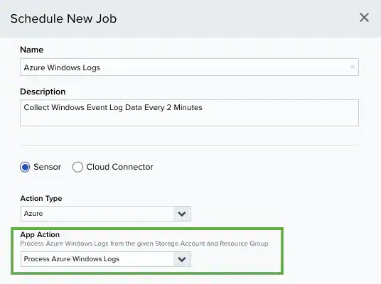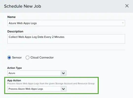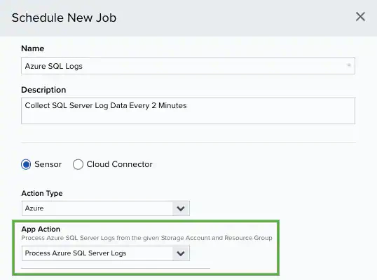 When you configure the new job, set the App Action option to Process Azure SQL Server Logs. You must also specify the Resource Group, Storage Account, and Table Container for the custom log collection job. See Create a New Azure Log Collection Job for more information about creating a new Azure log collection job.