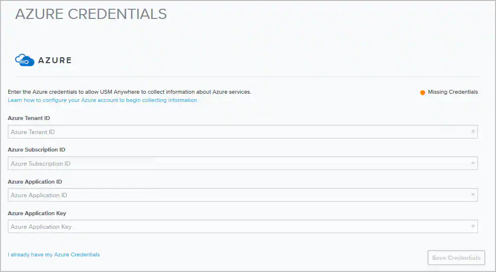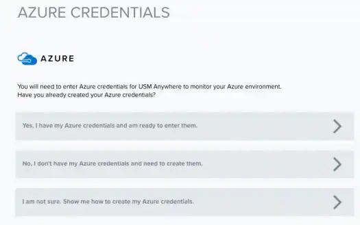 To complete the Microsoft Azure Sensor configuration, you must obtain Azure API credentials for the subscription that you want USM Anywhere to monitor. Select the option on the Azure Credentials page that matches your current Azure credential creation status:
