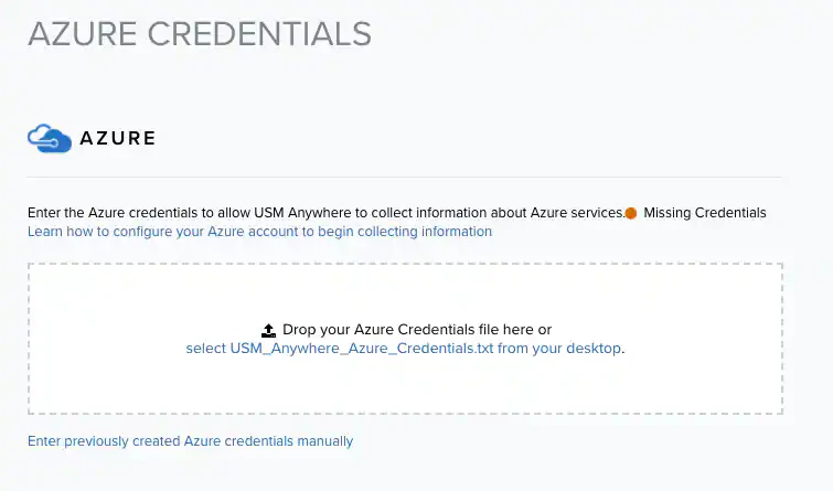 In USM Anywhere, drop the Azure credentials text file onto the displayed page or click the select USM_Anywhere_Azure_Credentials.txt from your desktop link to locate, select, and upload the file.