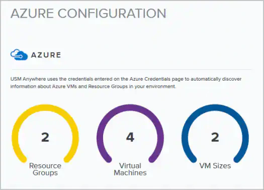 After you’ve successfully configured the Azure credentials, the Azure Configuration page opens. This page summarizes the number of Azure virtual machines (VMs), resource groups, and VM sizes in your environment.