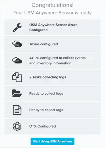 The first time you log in from the Welcome to USM Anywhere web page, the Setup Wizard prompts you to complete the configuration of the first deployed sensor. Thereafter, you can use the Sensors page to configure an additional sensor or to change the configuration options for a deployed sensor. See Sensors Page Overview for more information.